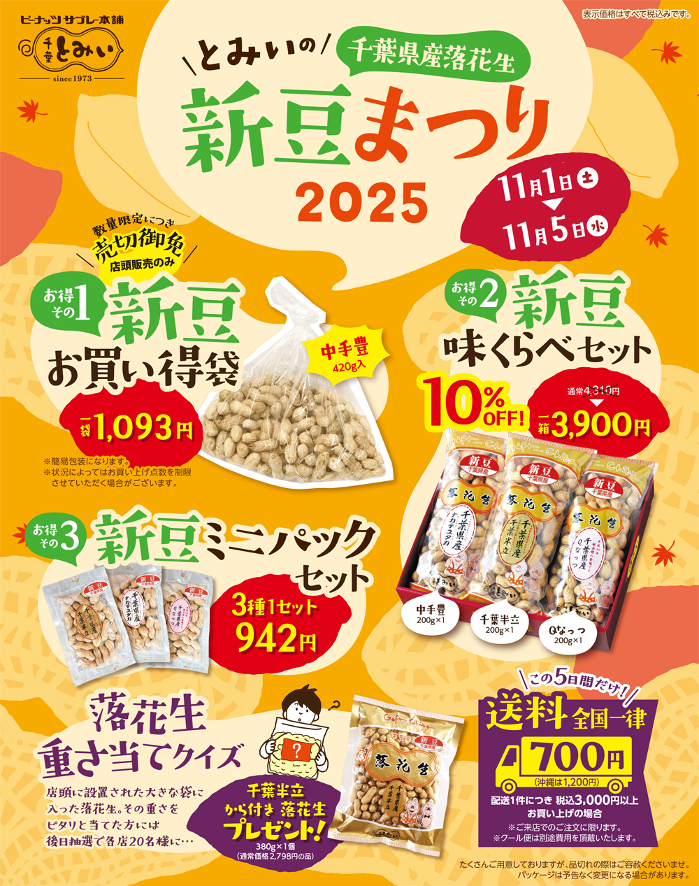 新豆の落花生やお買い得品の「新豆味くらべ」「新豆ミニパック」をご購入頂けます。